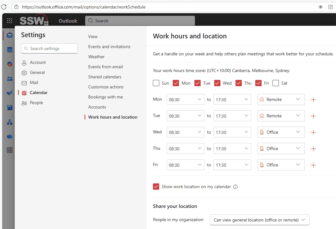 - Teams: Go to Calendar | Calendar Settings | Work hours and location