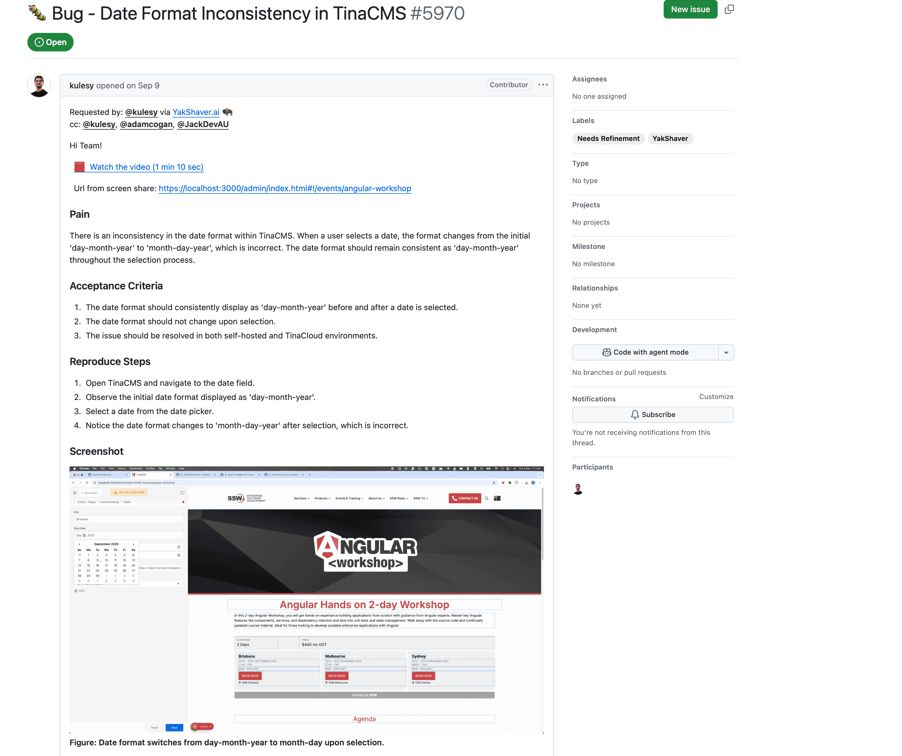 - It is important that you, especially a developer, knows how to use labels for GitHub issues when using an open source project on GitHub, as it would help compact issues and make the issue management workflow more efficient. Essentially, having such a predictable workflow will let the community feel professional. - Every new repository comes in with some default labels out of the box that you could use to label your issues to help create a standard workflow in a repository. A list of the default labels and their general uses can be found here: GitHub - Managing Labels - Depending on the project, there is often a need to create labels on top of the default labels. For instance, when you are using an internal project management solution (such as Azure DevOps) for an open source project, a new label "added to backlog" is created and applied to applicable issues specifically for demonstrating that an issue has been added to the Azure DevOps backlog and is being worked on for the community. - This way you can give the community an understanding of the current goals of the project and a higher feeling of interactivity with your development team. - Review and clean up labels- You should review the labels regularly and clean up outdated or irrelevant labels to keep the backlog clean and organized. A good use of labels can improve project clarity, enhance communication among team members, and streamline issue prioritization. In contrast, poor management of labels can lead to confusion, misaligned priorities in workflow. - When using YakShaver to create work items, they will be tagged with - Needs Refinement, this reminds developers to review the issue to ensure that the details are correct. Once the review has been test passed, ensure that this label is removed, so that other team members know that it ready to be worked on.- When to review a label- When the label is no longer relevant - For example, removing a "blocked" label after resolving dependencies or unblocking an issue