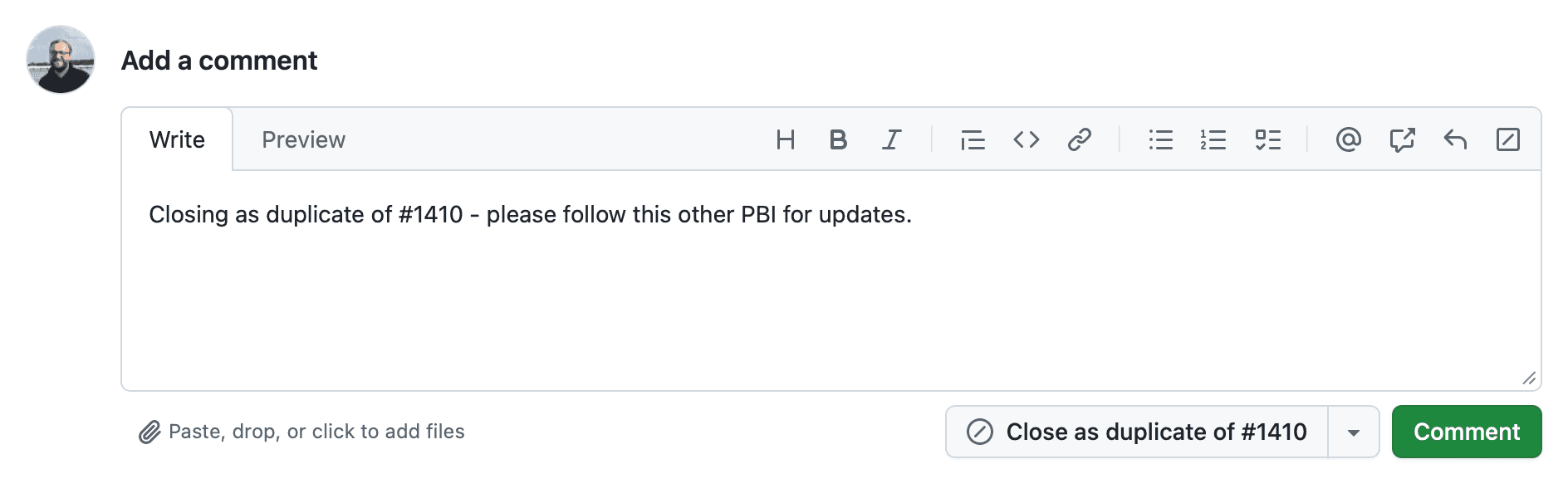 - Both methods automatically link the issue to the active PBI and make the relationship clear to other users. - Comment: "Duplicate" - Figure: Bad example - The issue is closed abruptly without context, which confuses the reporter - Comment: "Duplicate of #101 - follow here for further updates" - Figure: Good example - Using the built-in GitHub duplicate workflow keeps issues linked and easy to trace   - Figure: Good example - Using the built-in "Close as duplicate of..." button is an easy way to close an item while linking to the main PBI. It can be helpful to leave comment here for additional context - 3. Notify the users who created the duplicates- Since closing their PBI means they won’t receive future updates automatically, it’s essential to @mention those users in the main PBI so they know when the issue is resolved. - Comment on #101: - "@jane @sam closing your related issues (#102, #103) as duplicates. You’ll be notified here when this issue is resolved." - Figure: Good example - All reporters are acknowledged and notified when the main PBI is completed - Automate where possible- If your project frequently encounters duplicates, consider automating this workflow: - Use GitHub Actions or bots to suggest duplicates automatically based on title or description similarity