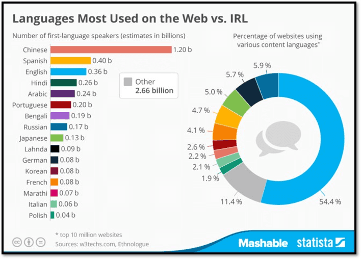 Figure: Many top-spoken languages remain underrepresented online, e.g. Chinese represents 13% of the world, but 2.2% of the websites