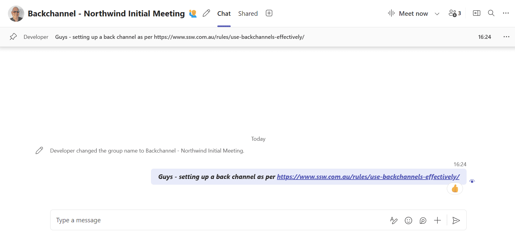 When using a private Teams Chat to backchannel a Teams Meeting, it's a good idea to name the chat at prefix with "Backchannel - {{ MEETING NAME }}".