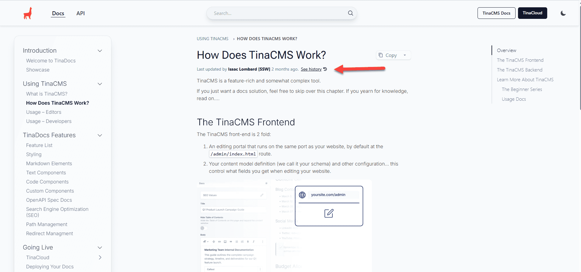 - A website’s main purpose is to share information, promote products or services, and engage with its audience while building trust and credibility. Showing a “Last Updated By” label or a content history link adds transparency, assures visitors that content is maintained by real contributors, and reflects accountability and professionalism. - The example page explains how TinaCMS works, but users can’t tell whether the content reflects the latest version since recent updates or changes might not be apparent. Without this information, it’s hard to determine the authenticity or accuracy of the content. - In this example, the page shows that the content was last updated by Isaac two months ago, indicating that it’s still valid and reliable. This helps the audience understand how frequently the content is updated and assures them that the information is kept current. - It also benefits maintainers by allowing them to see who made the latest changes directly on the site, without needing to open GitHub or check the page’s commit history.