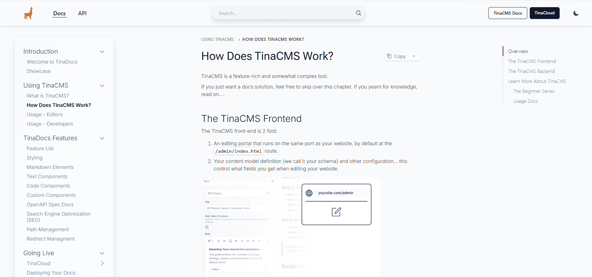 - Introduction- When it comes to creating, managing, and hosting documentation, choosing the right tool can significantly impact productivity and user satisfaction. - Poor documentation platforms can lead to confusion, inefficiency, and a lack of engagement. - Conversely, selecting the right tool can enhance clarity, collaboration, and overall user experience. - Top Documentation Sites- Here are some of the top online documentation sites: - TinaCMS- Features: - Git-based