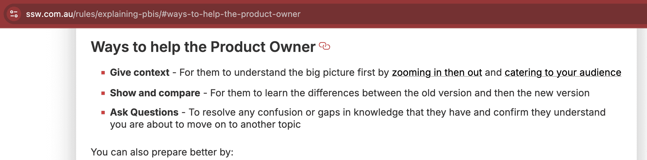 - When redirecting users to another page, make sure that the text is consistent between the two pages. - When we want to point users to a page, we simply use the summary part of that page as narrative on the other page. As a result, the user will have a nice flow between pages when navigating around the site. - As an example, the SSW website follows a consistent order: a summary of the product/service and its benefit, followed by a link for more information on that topic. - Tip: In this scenario where the summary serves as a teaser for more detailed content, have the link at the end of the section, so it's the natural next step for someone who has read it and wants to know more.
